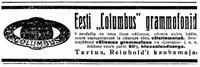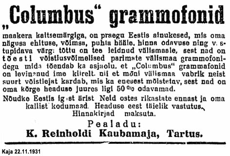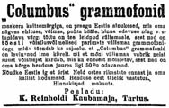 "... Tartu tuntud kaubamaja omanik K. G. Reinhold on konstrueerinud uuema tüübilise odava grammofoni "Columbus" - kaitsemärgiga: