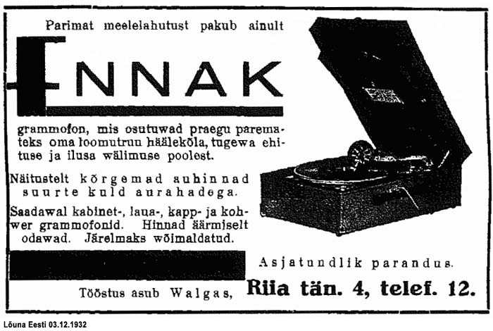 Isamaalane 11.12.1932: "Grammofone mitmes suuruses ja headuses valmistab A. Uuk, Tallinnas, Voorimehe tän. 1. Need Eesti grammofonid