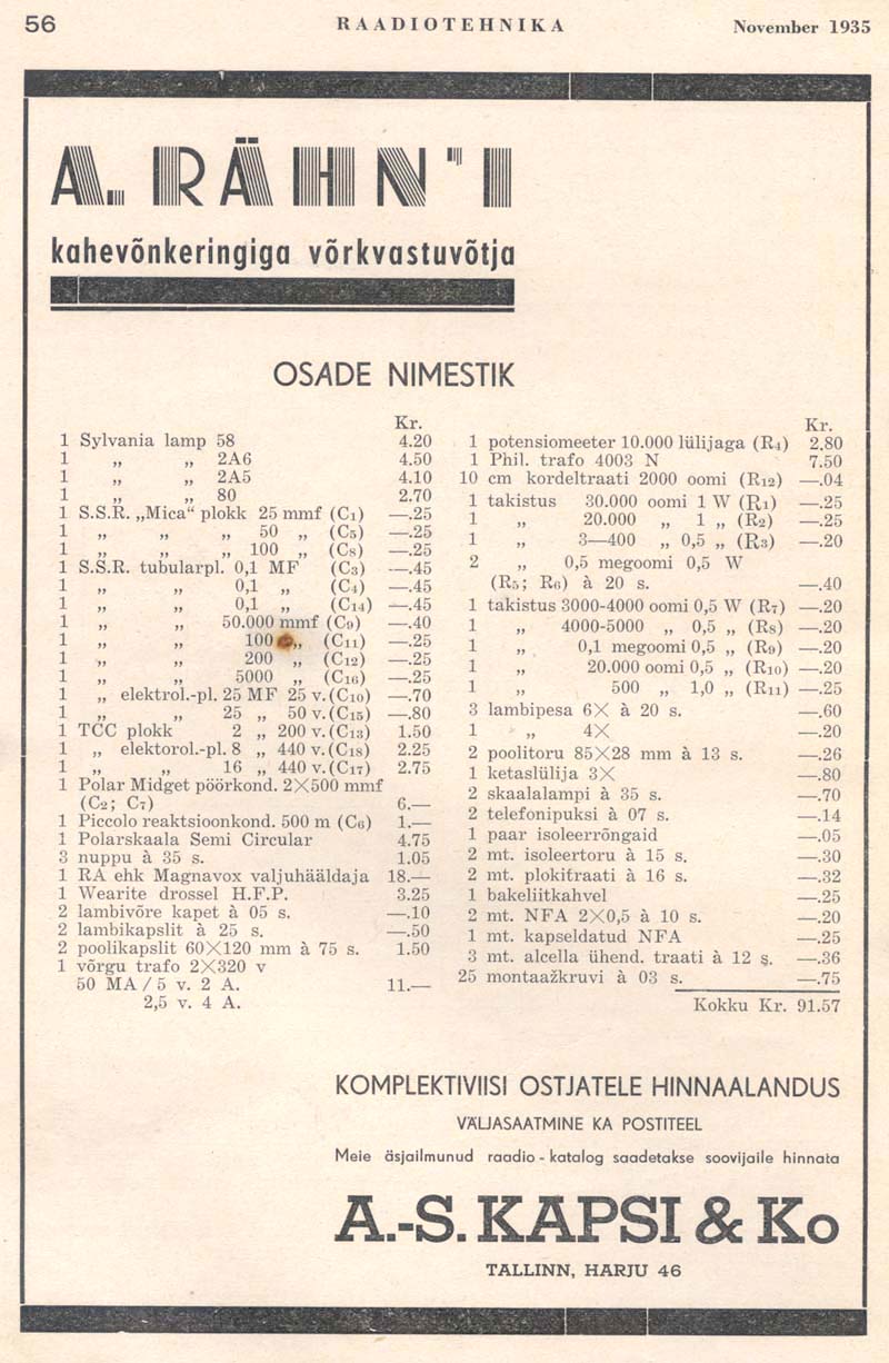 komplekti nimekiri Raadiotehnika 2, november 1935.