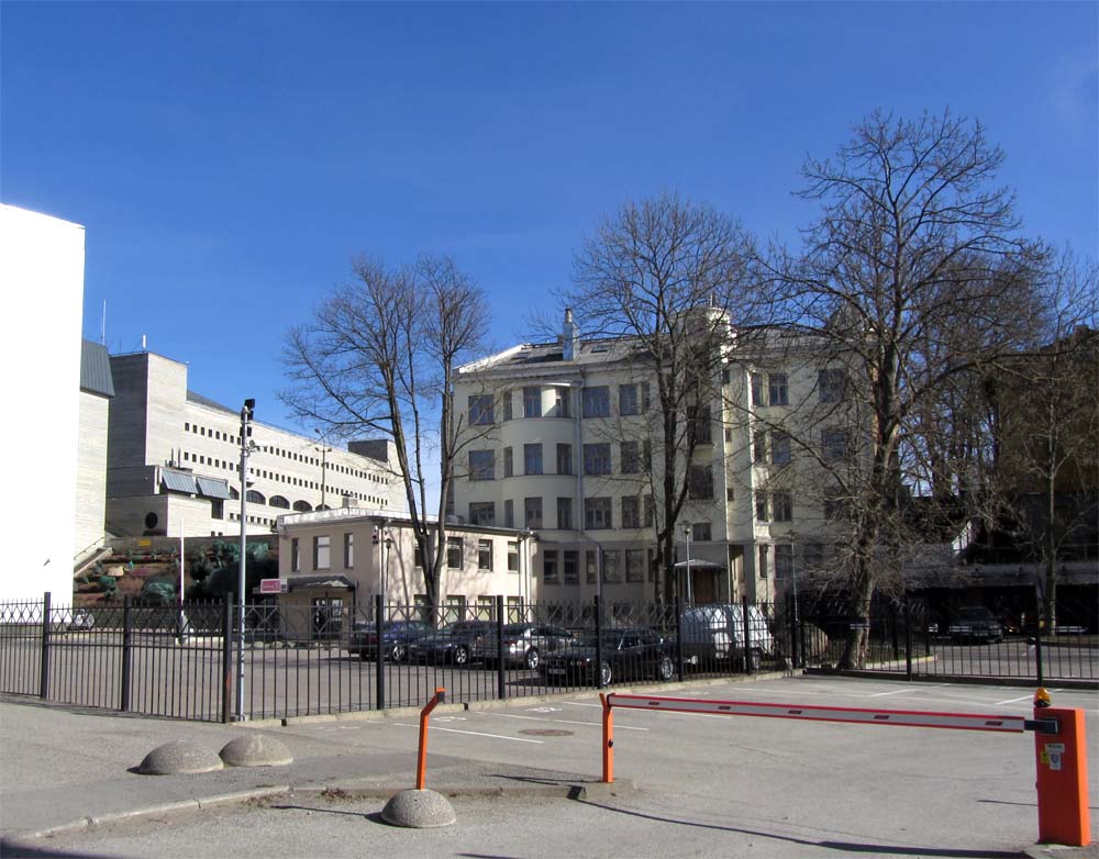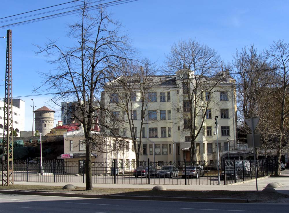 Tallinn, Endla 9, kus 1934-1939 asus Jaakson & Jätmar ja Jaakson & Ko raadiotehas. Puude taga paistev kivihoone on sama krundi