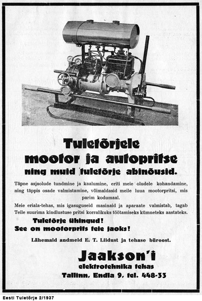 1936. a. lõpus ja 1937. a. alguses reklaamis Jaaksoni tehas ajakirjas Eesti Tuletõrje oma tööstuse mootor- ja autopritse.
