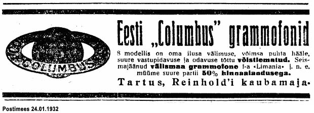 "... Tartu tuntud kaubamaja omanik K. G. Reinhold on konstrueerinud uuema tüübilise odava grammofoni "Columbus" - kaitsemärgiga: