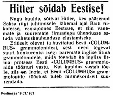 1933 võidi müüa ka juba varem lattu valmistatud grammofone). Ehkki Columbus-grammofone hakati valmistama juba 1929. aastal,