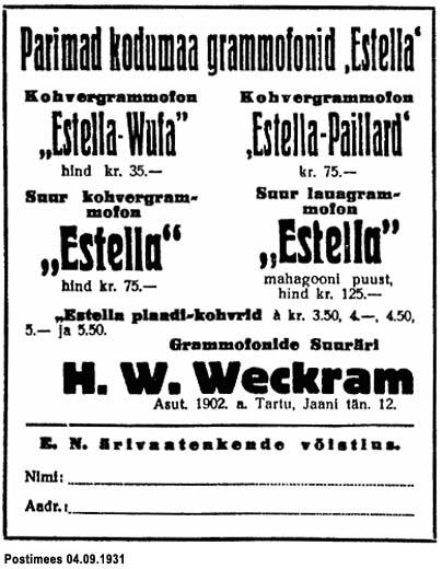 Grammofonitööstus Estella, H. W. Weckram, Tartu, Kloostri 10-13