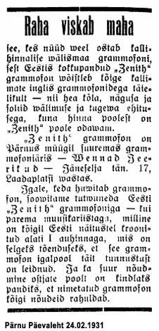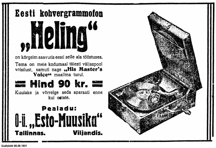 Päevaleht 23.07.1930: "Grammofonide valmistamine Tallinnas. Grammofonide eest läheb iga aasta õige ümmargune summa välisvaluutat kaduma,