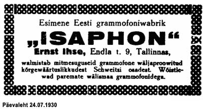 Esimene Eesti grammofonitööstus Isaphon, Ernst Ihse (30), Tallinn, Endla 9 (30)