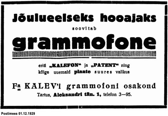 grammofoni, "Kalefoni" ja "Patendi" nime all müügile saatnud, millel menu pole puudunud. ..." (Postimees 1.12.1929)