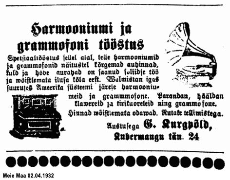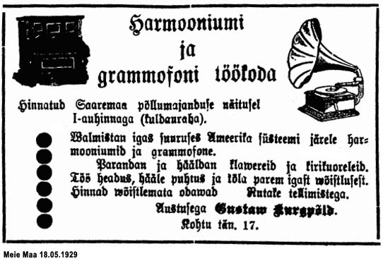 Oma Maa 25.08.1928: "Muusikariistade turg Eestis... Vähemate muusikariistade valmistamise kohta on andmed, et grammofonisid valmistati