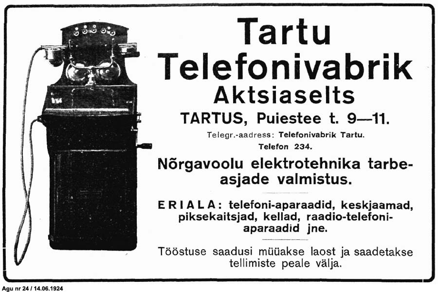 *AS Tartu Telefonivabriku reklaam /Agu 24/1924, Eesti Rahvusraamatukogu digitaalne arhiiv (digar.nlib.ee)/;