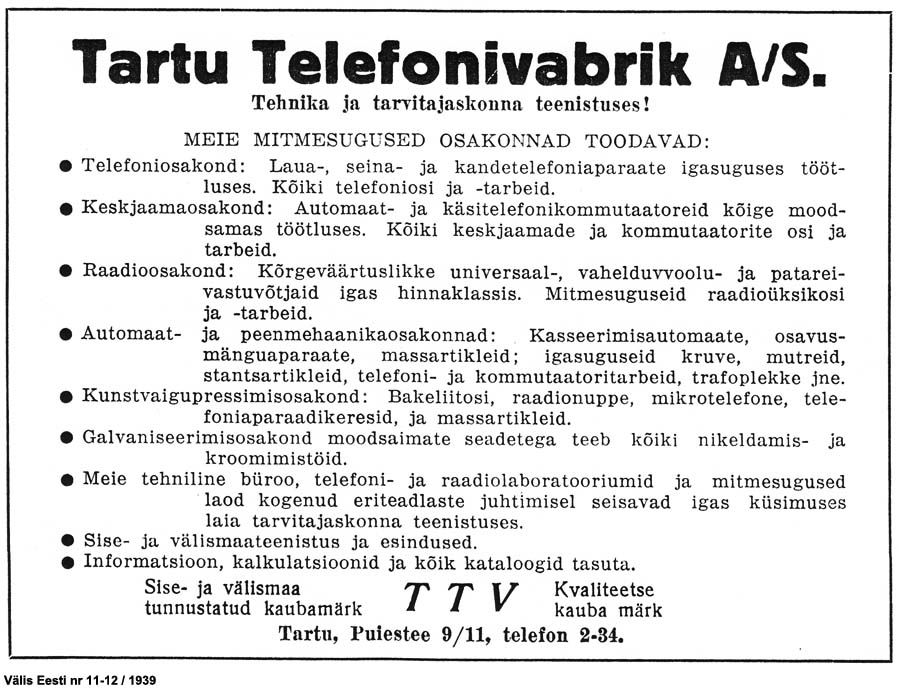 *AS Tartu Telefonivabriku reklaam /Välis Eesti 11-12/1939/.