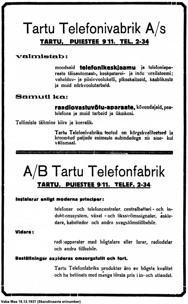 *AS Tartu Telefonivabriku 3 võõrkeelset reklaami ajalehe Vaba Maa Saksa (17.02.1937), Soome (29.04.1937) ja Skandinaavia (18.12.1937) erinumbrites /Digiteeritud eesti ajalehed (dea.nlib.ee)/.