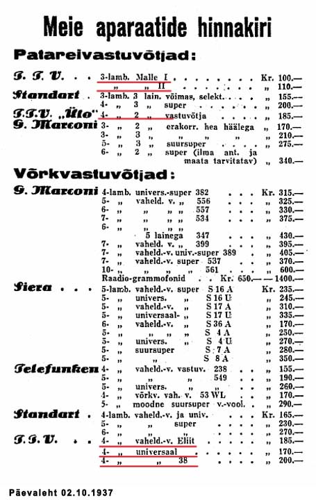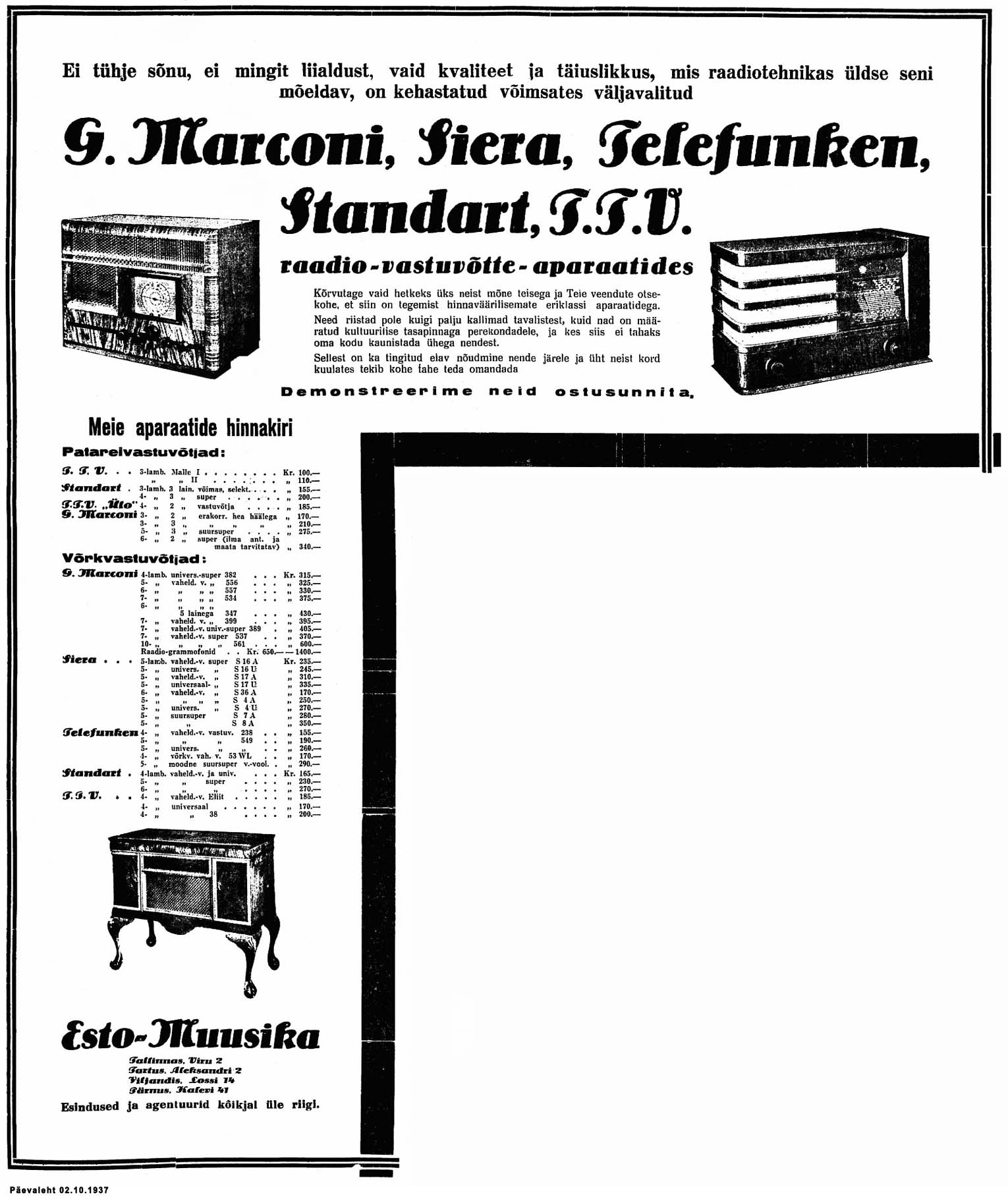 TTV mudelinimetusteta reklaam (RS Nr 40 01.10.1937) ja OÜ Esto-Muusika reklaam (Päevaleht 02.10.1937).