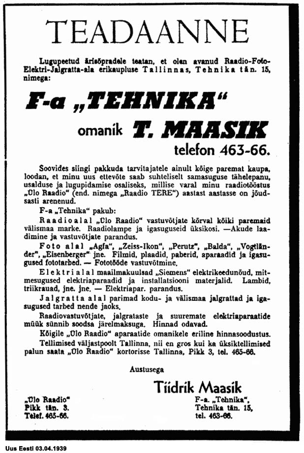 1939. a. kevadel avas ka "Firma "Tehnika", omanik T. Maasik" (hilisem Rahva-Raadio).