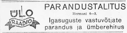 Eesti Sõna 22.02.1942: "Ülo Raadio Parandustalitus Hermani 6-3. Igasuguste vastuvõtjate parandus ja